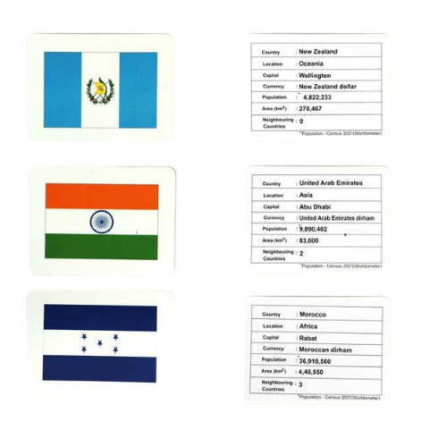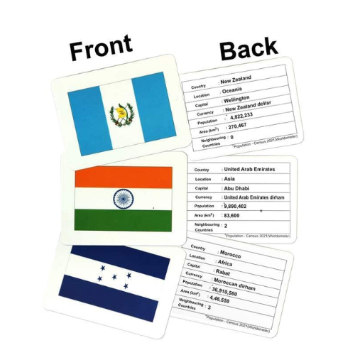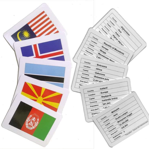 • These flash cards go beyond just teaching flags; they offer a dynamic and playful approach to learning about different countries’ flags and much more. The cards are intentionally designed to be interactive, making the learning process enjoyable and fun. The captivating images on the cards effortlessly capture children’s attention and help improve their concentration and observational skills.