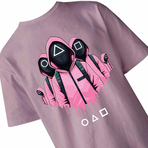 Classic crew neck tee shirt with attractive design of squid games pink soldiers masked men and the iconic element from the series and its perfect for the squid games fans