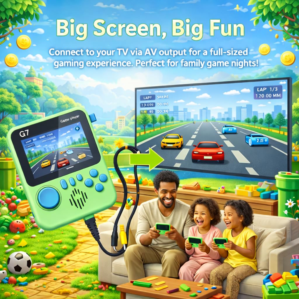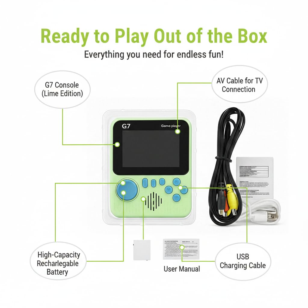 TV Connectivity & Complete Accessories – Supports TV gaming through AV output. Package includes handheld game console, AV cable, USB charging cable, and user manual—ready to play out of the box.